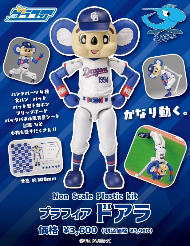 1994年のデビュー以来、球界の枠を超えて愛されてきたドアラのユニークで愛らしい表情や仕草が、プラスチックキットとして初めて立体化されました。全高約10cmと、デスクに飾るだけでなく、一緒にお出かけもしやすいサイズ感が魅力です。