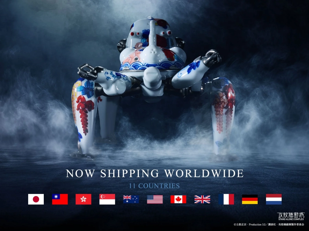 『攻殻機動隊展Ghost and the Shell』での先行受注で完売した「タチコマ鍋島焼」が、世界中からの熱い要望に応え、グローバルオンライン予約販売を継続しています。これまでの日本を含む7カ国に加え、新たにオーストラリア、イギリス、カナダ、オランダが加わり、世界11カ国への発送が可能となりました。また、国内では2026年5月中旬ごろより、大丸松坂屋百貨店の会員制サービスでも取り扱いが開始される予定です。