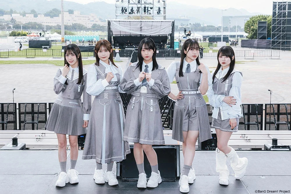 「BanG Dream! Project」のメンバーと思われる5人の女性が、グレーと黒を基調とした統一衣装を着用し、屋外ステージでポーズをとっている